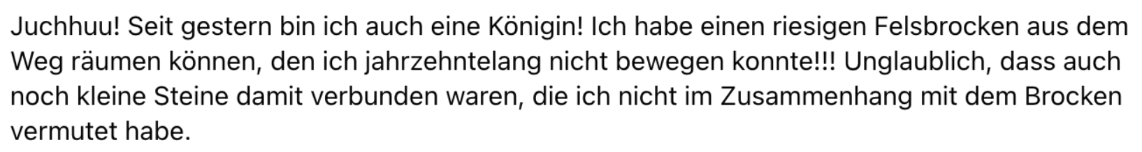 Noch mehr hin zu einem Mindset einer selbstermächtigten, selbstbewussten, befreiten Frau, die als KÖNIGIN in ihrem eigenen Leben denkt, fühlt und handelt.